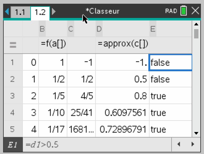 Pour déterminer le premier terme de la suite définie en colonne C (ou D) plus grand que 0,5 , on peut saisir en cellule E1 la question "=(B1>0,5)", puis tirer vers le bas.